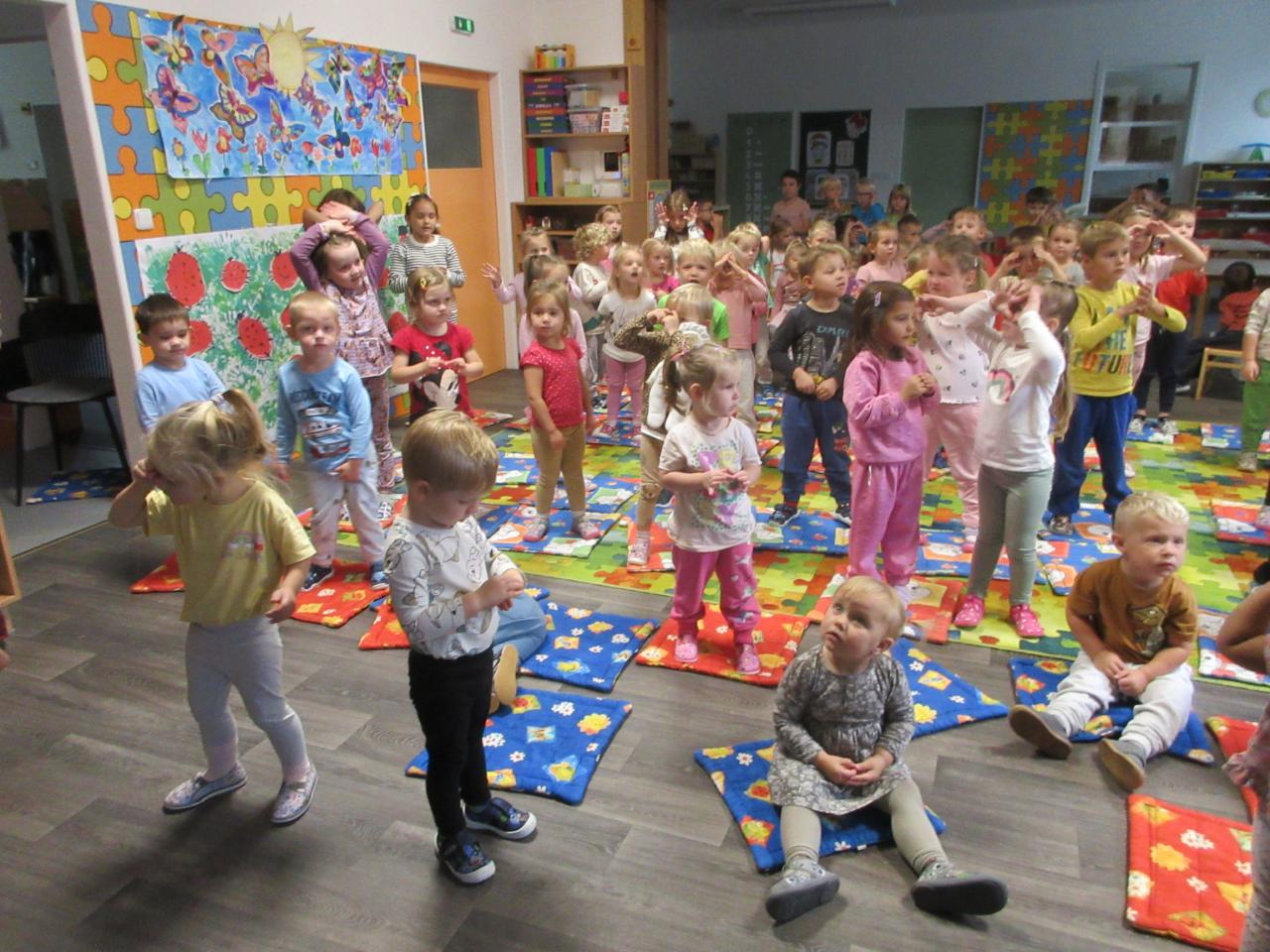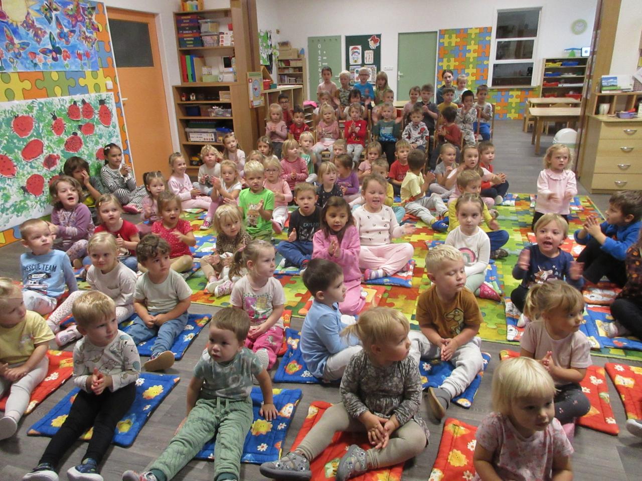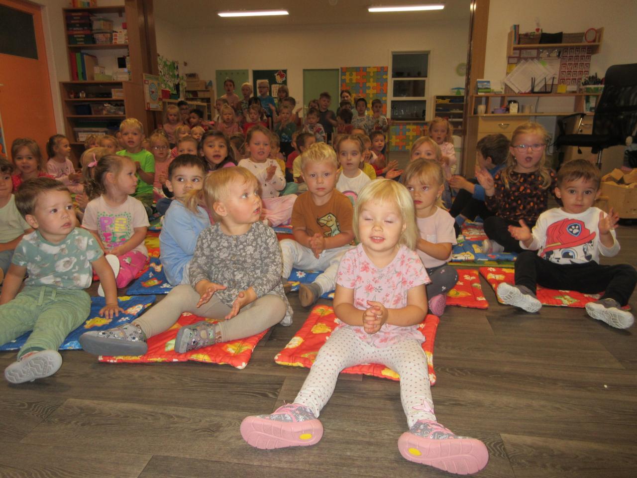 První celoškolní setkání dětí s interaktivní pohádkou hranou učitelkami a s písničkami "Naše školka", "Kočka leze dírou", "Dešťové kapičky".