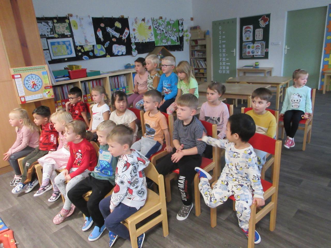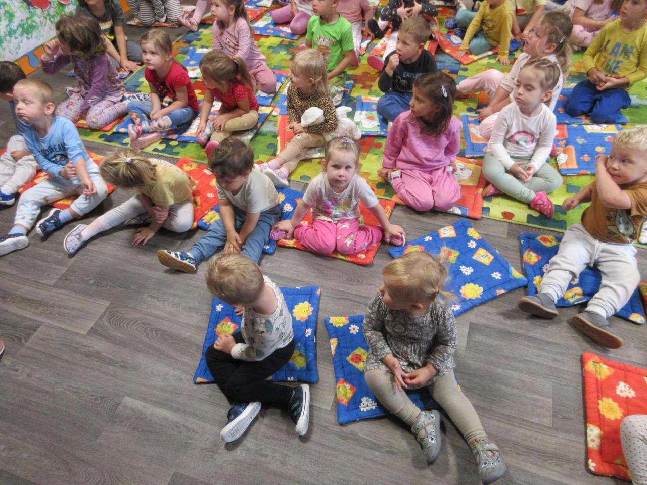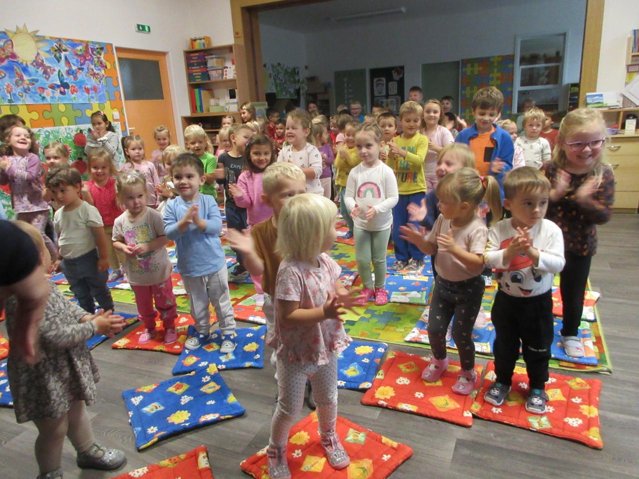 První celoškolní setkání dětí s interaktivní pohádkou hranou učitelkami a s písničkami "Naše školka", "Kočka leze dírou", "Dešťové kapičky".