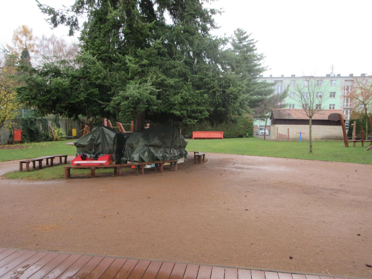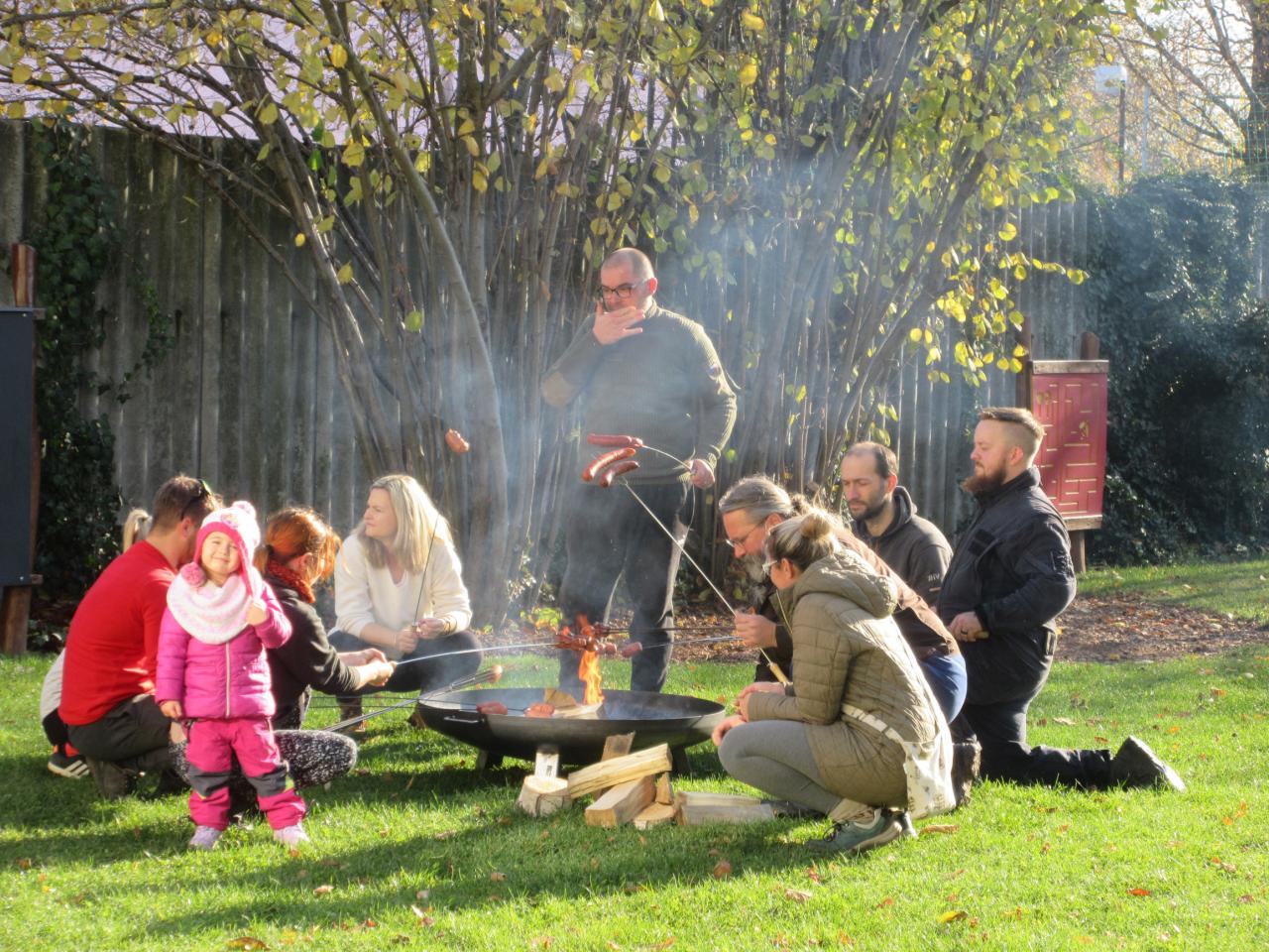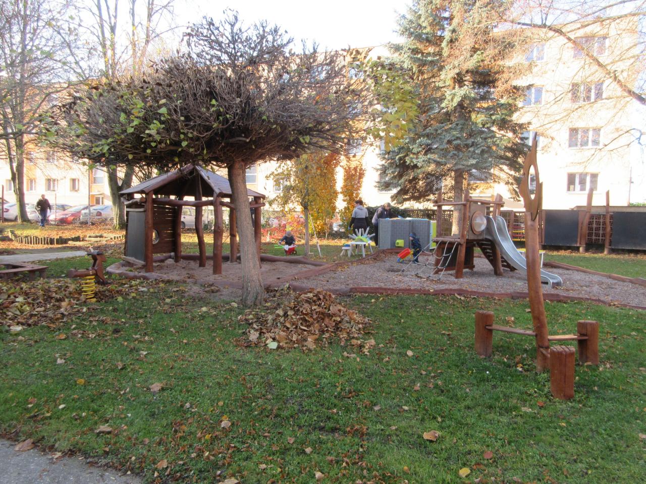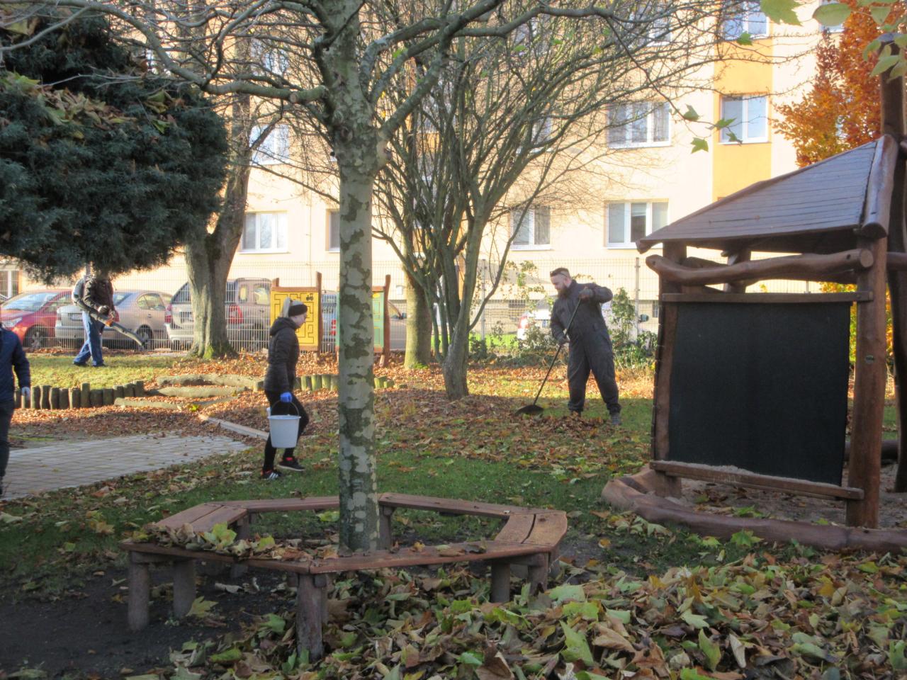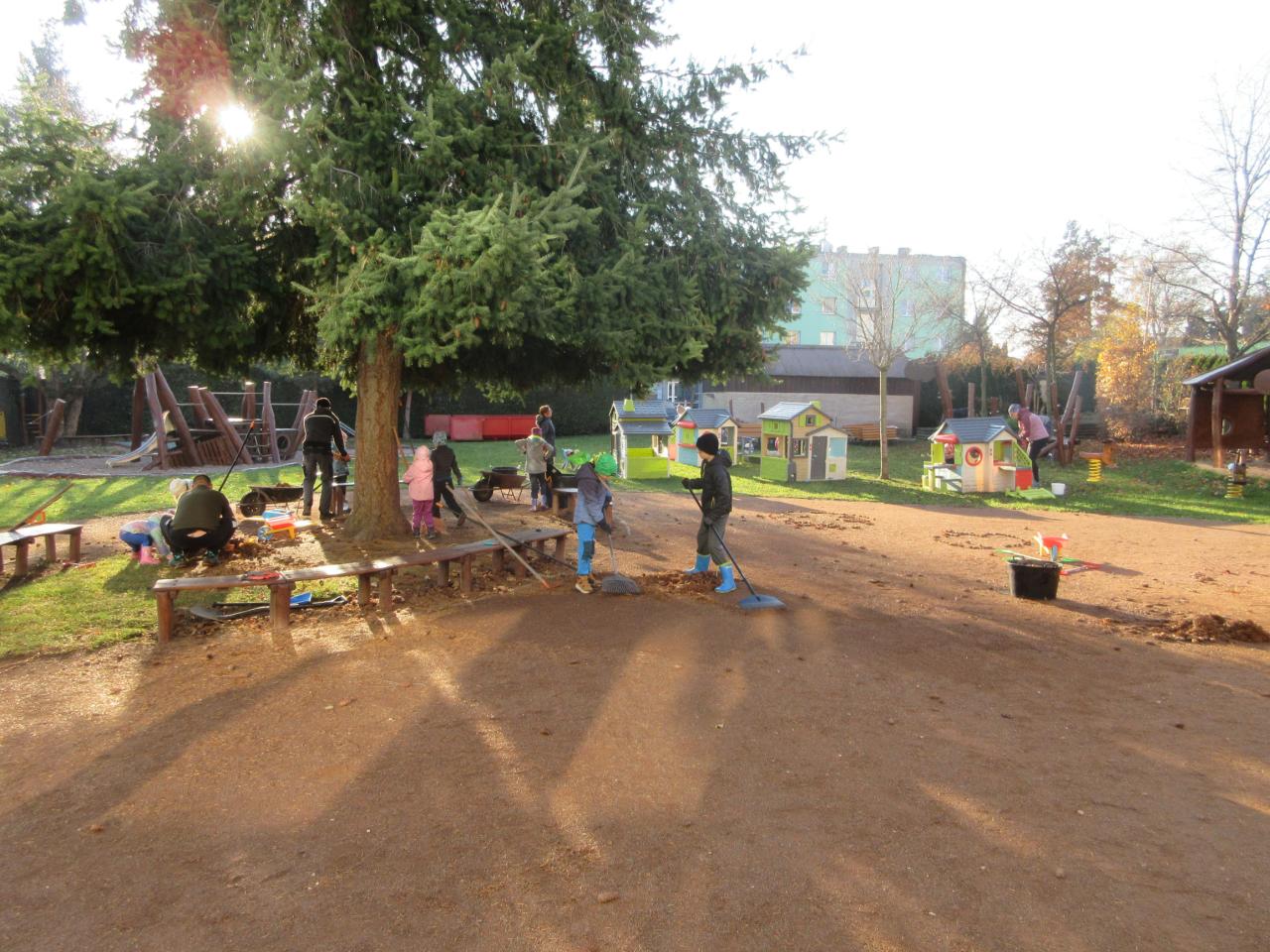 Sobotní dopolední úklidová brigáda na školní zahradě, na které se sešli a společně pracovali rodiče, děti a zaměstnanci MŠ.